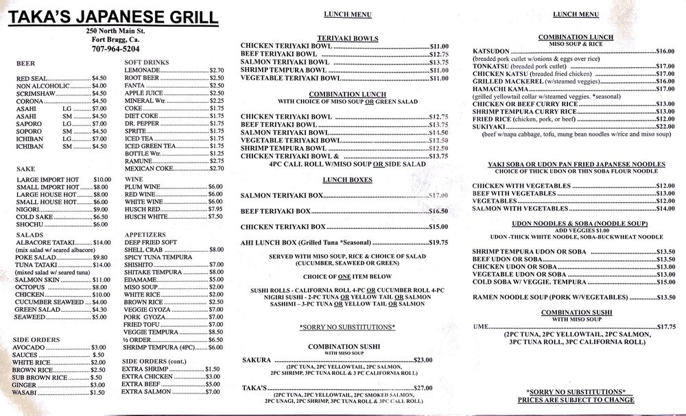 Welcome to Taka's Grill, a hidden gem nestled in Fort Bragg, CA, where sushi lovers and families alike gather for comfort and creativity in Asian cuisine. This unclaimed sushi bar stands out for its welcoming atmosphere and exceptional service, making it a perfect stop for lunch or dinner.
